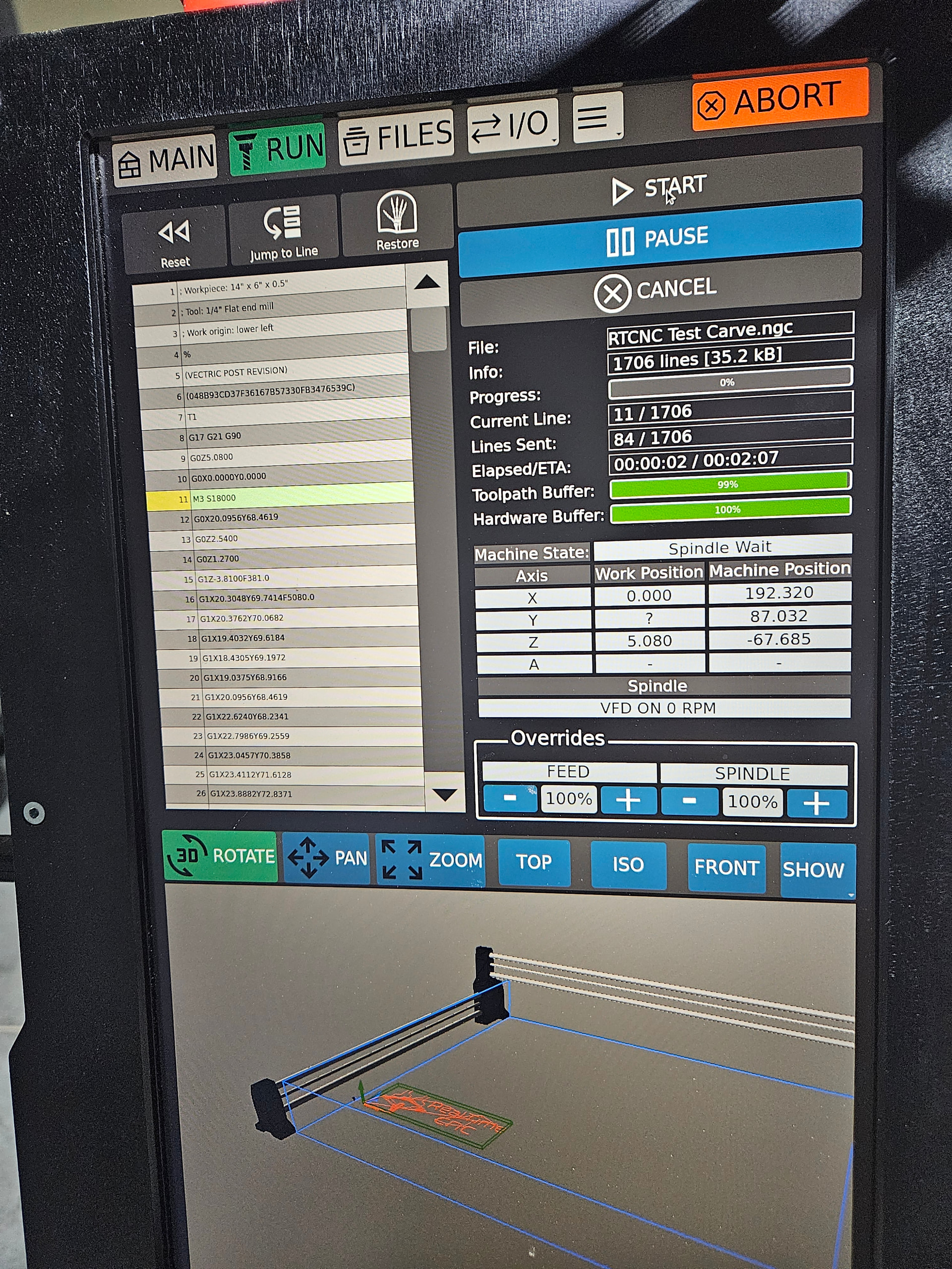 if your code is getting ‘stuck on the m3 sXXXXX code line, it’s most likely because your redline controller is selected for the redline spindle under the ‘spindle’ tab, but your vfd is either not on or in manual mode, so the controller is waiting to hear back after sending the ‘m3 command (turn on spindle and spind at whatever rpm the file says)), and never hears back, so it ‘get stuck’ (really, it’s just waiting to hear back from the spindle to move onto the next line of code, which it never will, so it appears ‘hung’.)