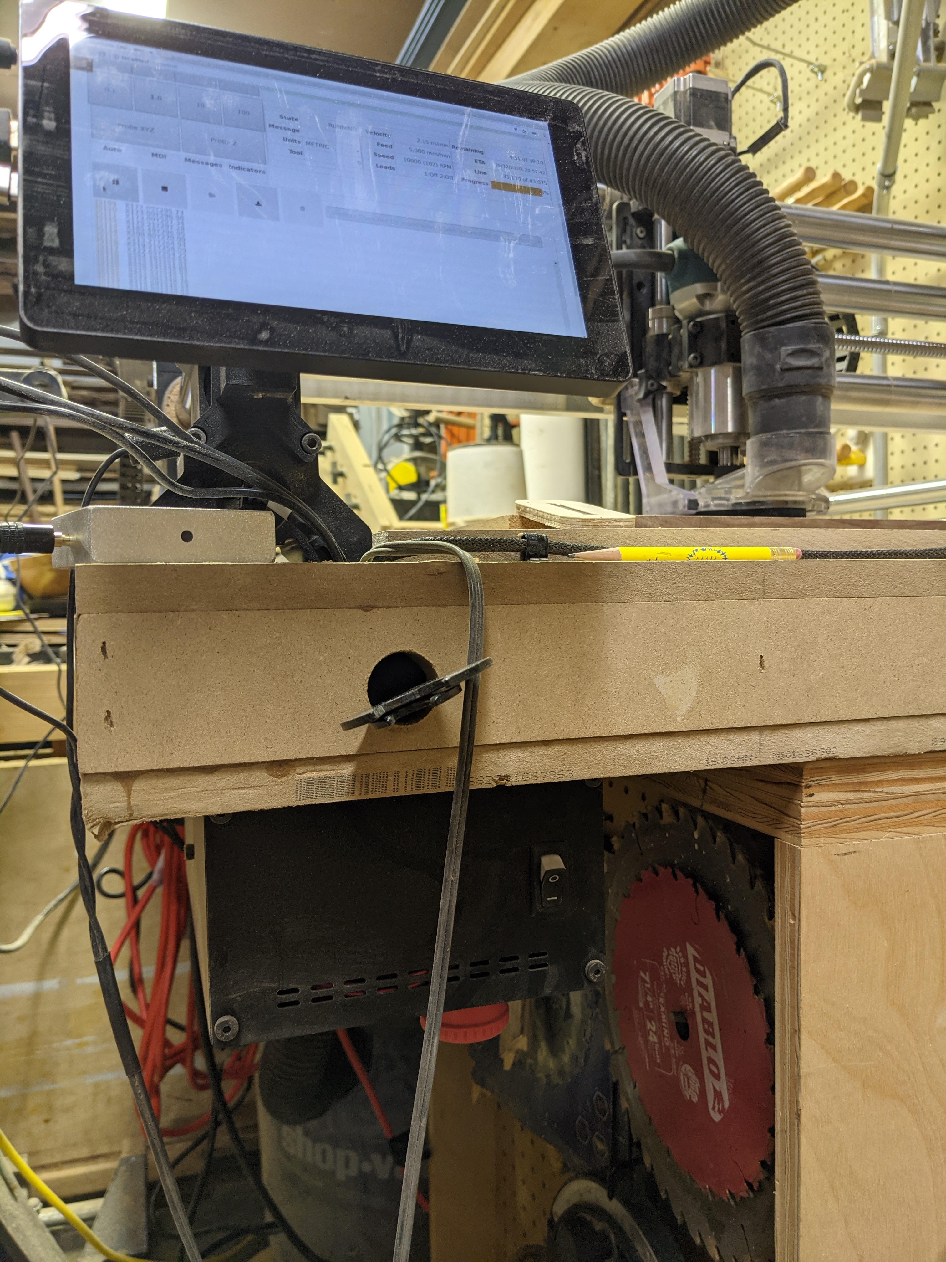 I’ve mounted mine on the left but inside the wing of my torsion box on a drawer slide so it can be slid out of the way or pulled out for easy access to the plugs in back or to use the emergency stop. We’ll see how that works out.