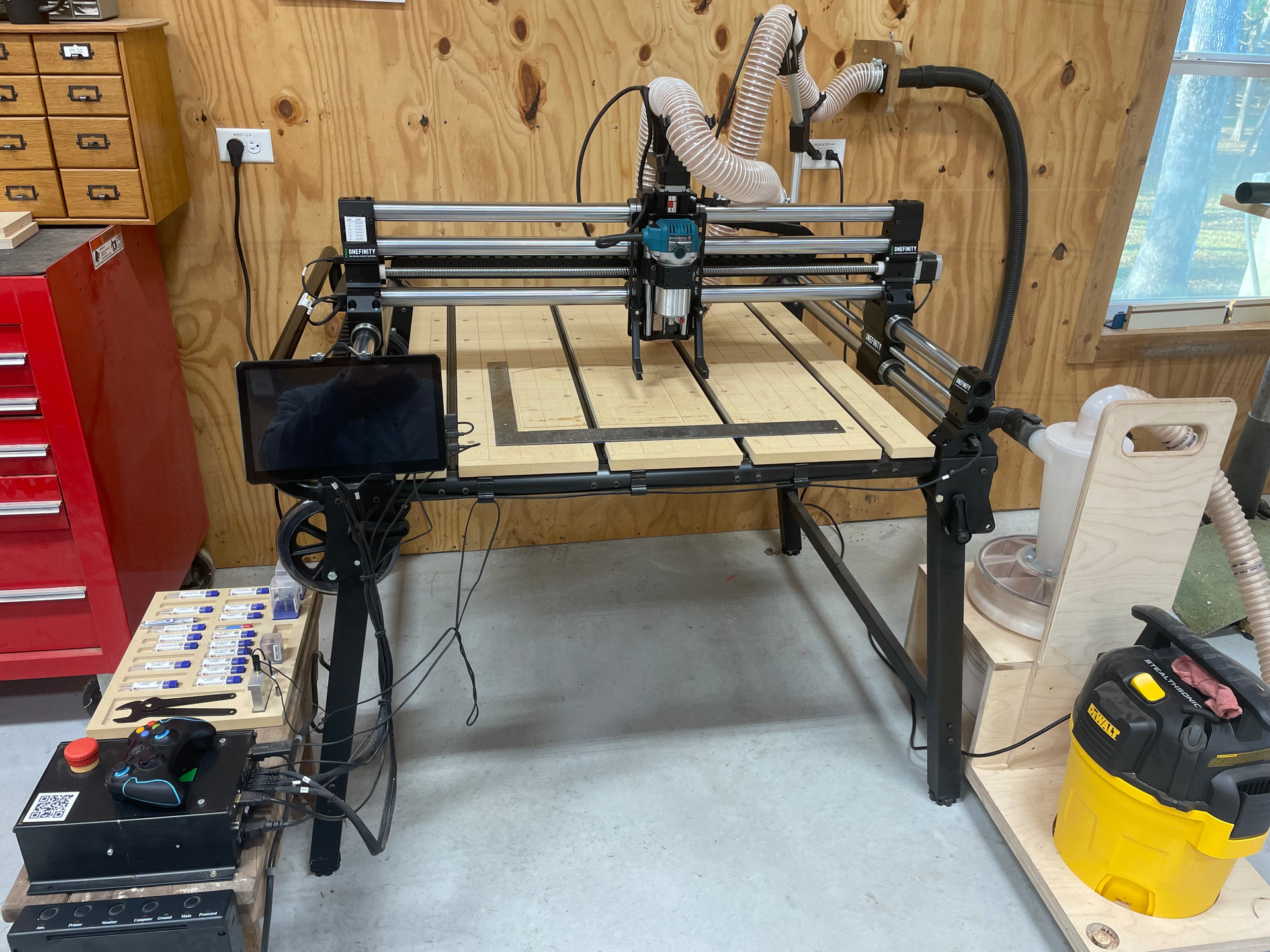 It has been one year since I purchased my Woodworker and I thought you might like to see it in my shop. On the left is the controller along with a case (made on the CNC) for my bits, wrenches and probe block. On the right is a custom made dust collection system.
