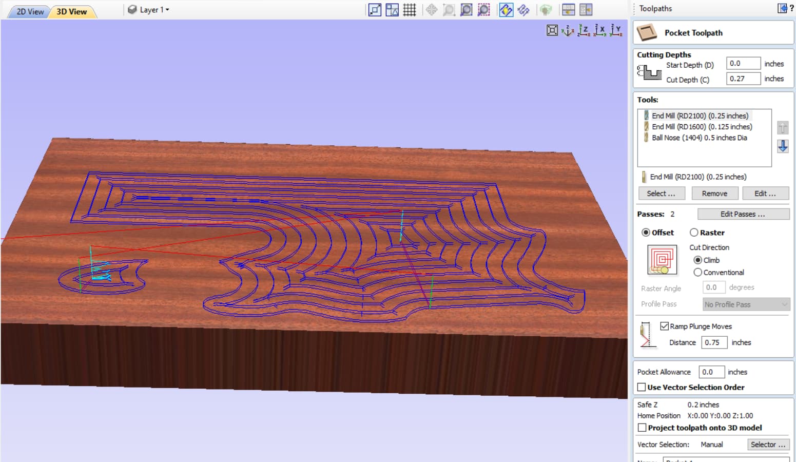 I reduced the stepover of your larger clearance bit slightly — 80% to 75%. But please don’t ask me to explain the math behind why this works. All I know is the issue arises from using a circular/offset clearance toolpath and the way Vectric calculates the corresponding spiral ramps.