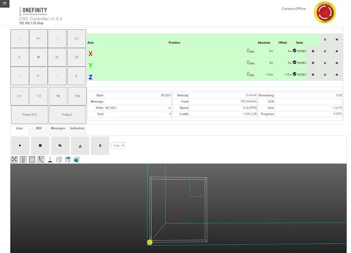 Here’s a screen shot of when things are correct. The x y and z have been homed AND zeroed. They also have enough room to move from their starting point and can complete the cut.