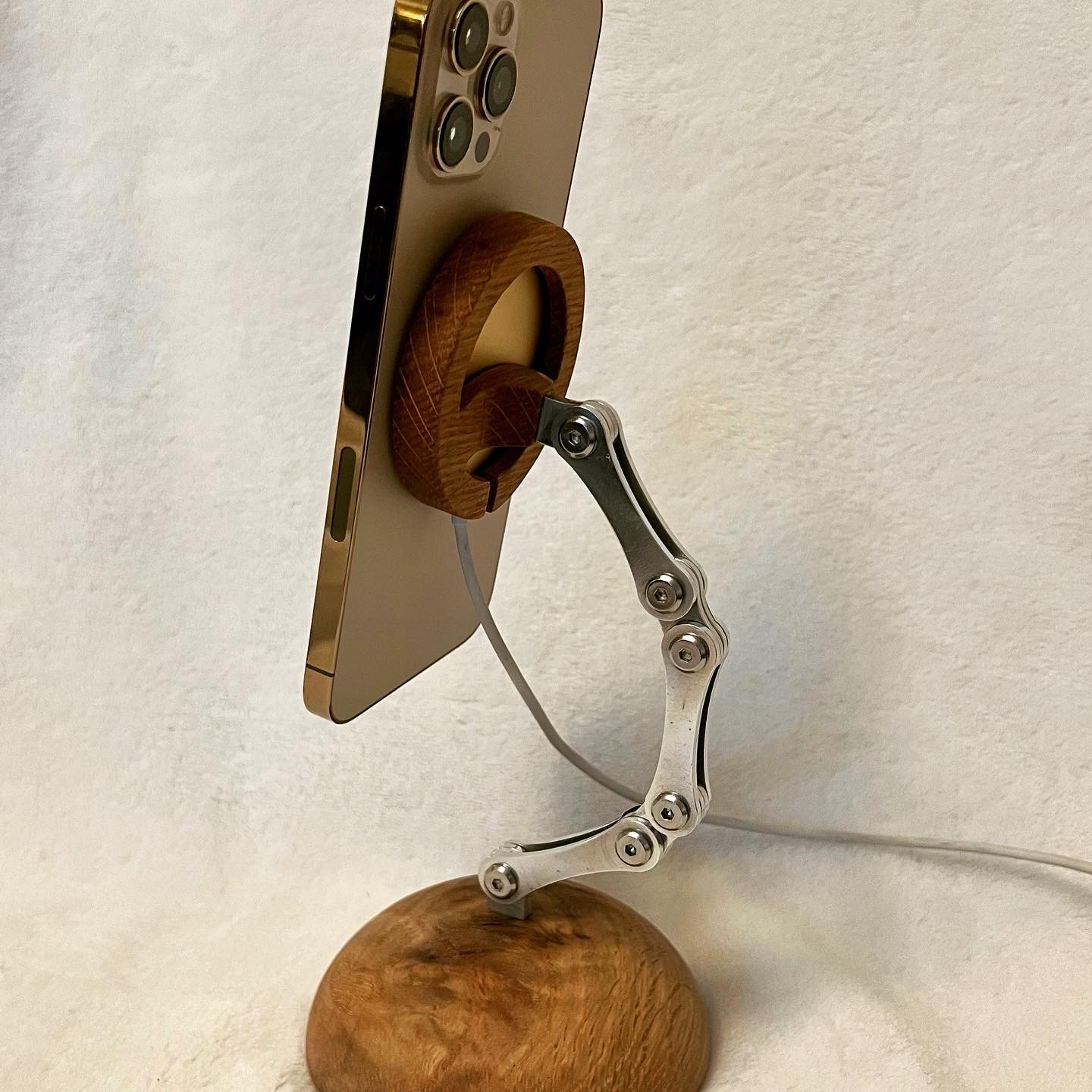 Promised my daughter a phone holder and finally settled on this. Dome (base) and head CNCed from white oak. The links were cut from .1" aluminum sheet. First attempt on the aluminum cut a little rough - dumped the 3-flute cutter for a single flute and solved that problem. Tumbled and polished the links to spruce them up a bit. Tightened the barrel nuts just enough that the links can be repositioned and still hold their place.