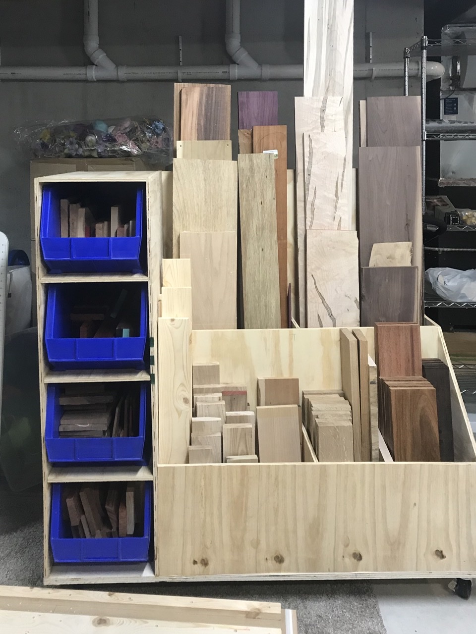 Since I am putting this CNC in my basement instead of the garage, I built a 2’x4’ lumber cart that I can roll around the basement floor. Bins for small cutoffs, standing slots for taller boards, and the back can hold larger sheets.